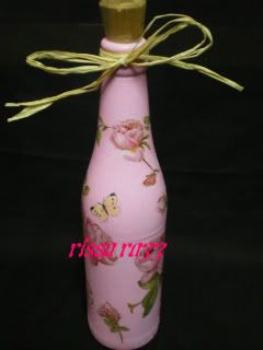 Teruja sangat bila tengok ramai peminat decoupage dah buat kat botol pulak....aku pun apa lagi habis jer cili sos dan kicap, botolnya cepat-cepat aku basuh dan keringkan... tak sabar-sabar kononnya, tapi terhenti seketika bila vitamin 'M' melanda...tersadai jugak botol tu kat rak. Tapi akibat dari kata-kata partnerku...maka terhasil akhirnya 3 biji botol yg siap dihias.